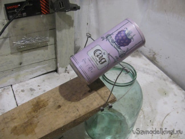 Первым делом нам нужно закрепить доску на банке, при этом самоделка должна легко сниматься с банки. Делаем хомут из проволоки, она у меня алюминиевая. Прикручиваем проволоку к саморезам, завернутым в доску. Чтобы доска лежала более надежно, можно немного подточить прилегающую часть доски, я работал болгаркой с обычным отрезным диском.