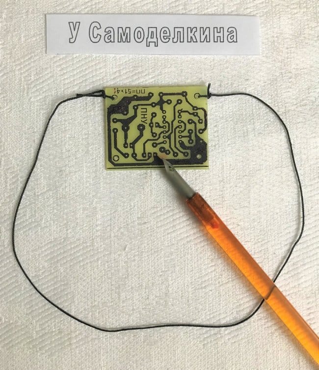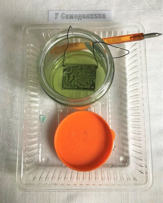 К ПП привязана суровая нить [5], взявшись за которую можно потряхивать ПП (для перемешивания раствора) и вынимать из банки для контроля степени протравленности. При этом руки остаются сухими, а точность определения момента окончания процесса возрастает. На рисунке 6 перо ручки указывает на место недостаточного протравления, определить которое на плате, находящейся в растворе не предоставляется возможным. Это пятно светло оранжевого цвета легко заметить, вынув ПП из раствора, и устранить повторным погружением ПП в травящий раствор ещё на несколько минут. При этом, если есть риск перетравления остальных участков платы, ПП можно погрузить в раствор лишь частично. Более тщательный способ обработать именно непротравленный участок — это промыть и вытереть ветошью ПП насухо и аптечной пипеткой нанести травящий раствор на непротравленное место.