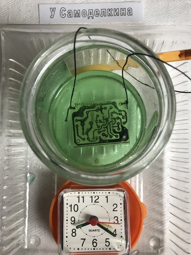 Вследствие химической реакции травления ПП, слегка жёлтый травящий раствор слегка позеленел, а рисунок трассировки стал хорошо виден невооружённым глазом.