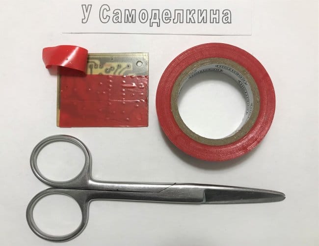 Перед покрытием фольгированной стороны ПП жидкой канифолью (флюсом), другую сторону платы рекомендуется закрыть изолентой [8]. Для этой цели хорошо подходит лента фирмы «Крептон», однако, не исключается использование малярной ленты и даже прозрачного скотча разных производителей. Скотч, правда удаляется с платы с некоторым затруднением. Некоторые скотчи оставляют часть клеевой основы на печатной плате, что делает внешний вид ПП непривлекательным. Заклеивание платы изолентой позволяет значительно уменьшить и даже полностью исключить затекание жидкой канифоли в просверленные отверстия. Это заметно ускорит установку РЭК на плату. Если часть отверстий всё же окажется забиты флюсом, то наиболее качественным способом их очистки будет повторное сверление.
