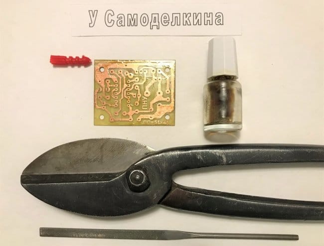 Обрезать ПП по требуемым размерам можно ножовкой по металлу, резаком, сделанным из ножовочного полотна, но быстрее всего [9] это можно сделать ножницами по металлу. Аккуратно это удастся сделать, если толщина ПП не превышает 1,5 ... 2 мм. Плату, изображённую на рисунке 9 предполагается обрезать по линии, на которую указывает красная стрелка. Острые кромки, которые образуются при обрезании, а также острые углы ПП желательно обработать надфилем или на плоском бархатном напильнике (буквально 1-2 движения ПП по закреплённому на столе струбциной напильнику для каждой стороны платы).