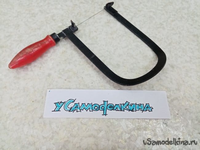 При помощи самодельной пилы с мелким зубом аккуратно отпиливаю от большой заготовки лишнее, кардинально уменьшая размеры. Выпиливать буду модернизированным коротким лобзиком.
