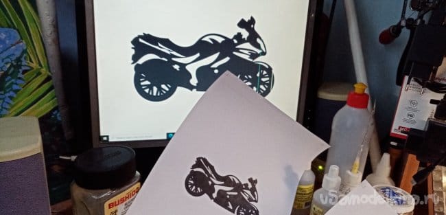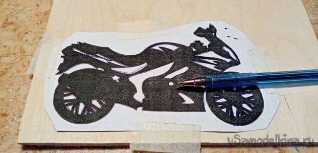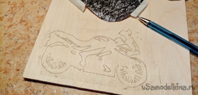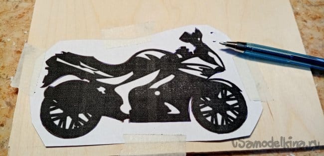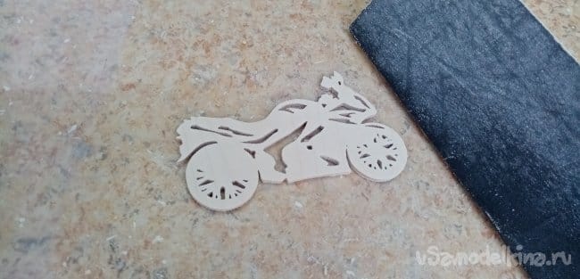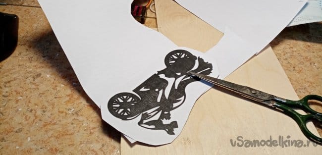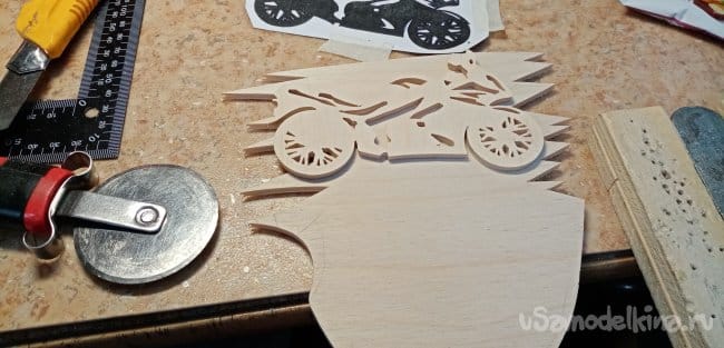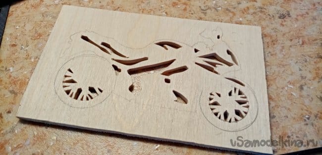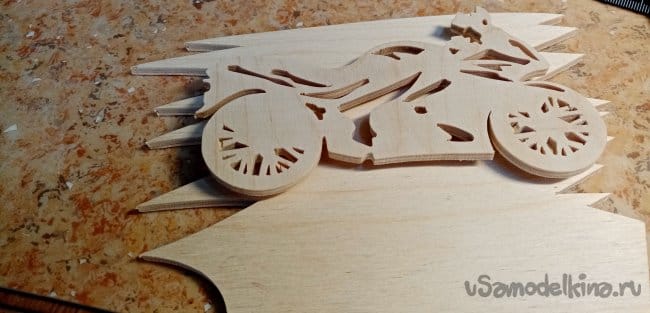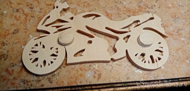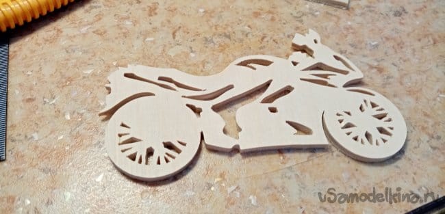 Опиливаю рисунок по внешнему контуру. Мотоцикл готов. Шлифую его утюжком со шкуркой осторожно, можно сколоть тонкие спицы при сильном нажиме.