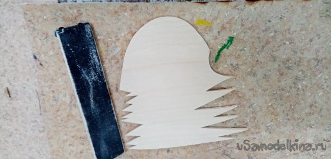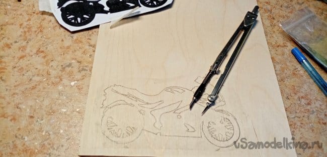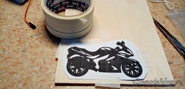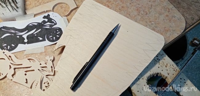 Нужно изготовить подложку-фон для установки мотоцикла и штырьков для ключей. Из остатков фанеры выбираю подходящий обрезок. Рисую вольным стилем «порывы встречного ветра».