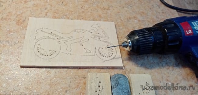 Во всех нужных местах просверливаю отверстия, минимального диаметра. Для продевания пилки. Особенно много тонких мест в колесах, спицы, знаете ли, напиханы в большом количестве. Собственно и рисунок выбирал максимально приближенный к оригинальному спортивному байку. Там похожий рисунок колес. Пришлось сверлить много.