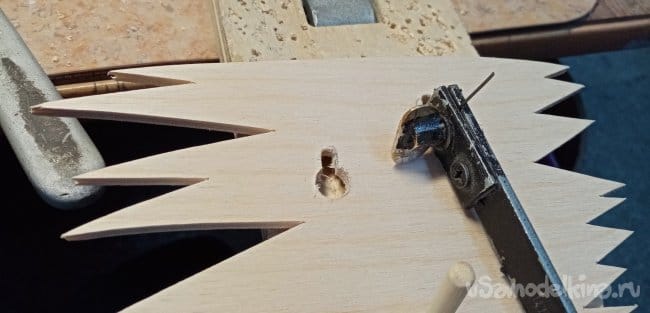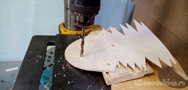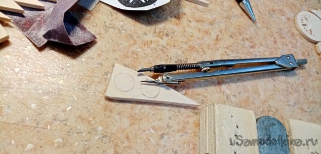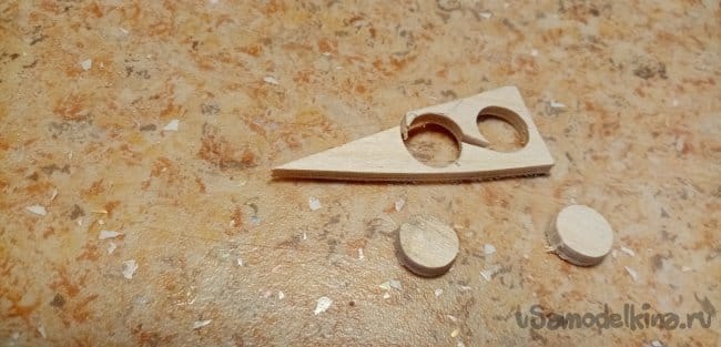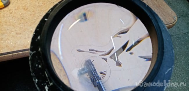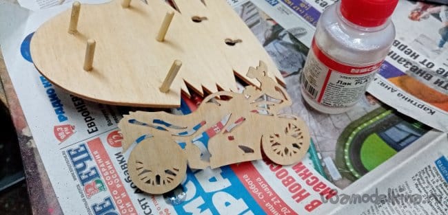 Переходим к фанеркам и деревяшкам. Выпиливаю кружочки. Приклеиваю с обратной стороны байка на ПВА. Использую хороший клей МОМЕНТ СТОЛЯР, стойкостью 3D.