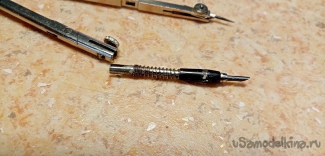 Долго маялся со стандартными зажимами стержня карандаша. Затем переделал этот узел. В качестве донора взял переднюю, часть от цангового карандаша, отпилил в размер, блок зажима с пружиной и припаял на остаток от лапки циркуля. Теперь можно использовать стандартные стержни и регулировать их выдвижение в процессе работы стало просто.