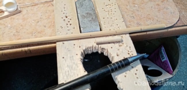 Из бамбуковой шпажки размечаю колышки для подвески ключей. Шлифую наждачкой, закругляю торцы.