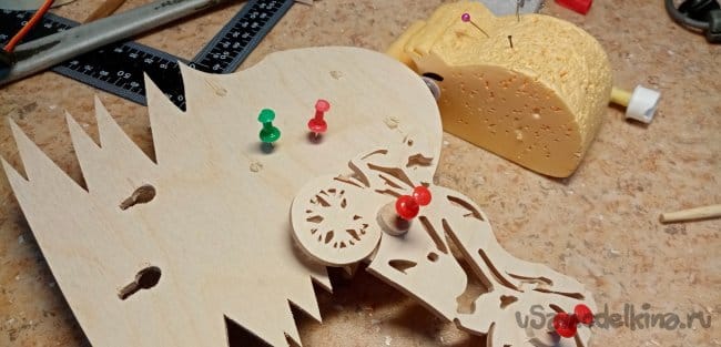 Готовы отверстия и штырьки. Нужно подготовить детали к покраске лаком. С обратной стороны втыкаю канцелярские булавки, парочку.