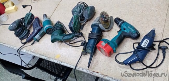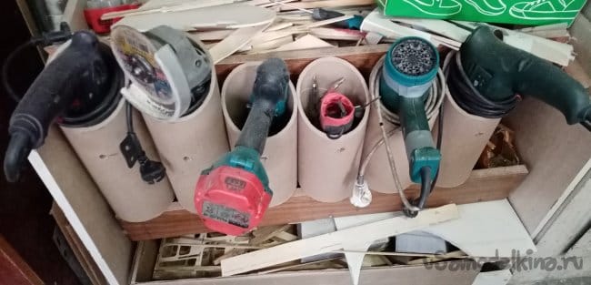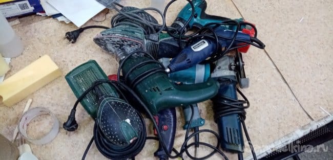 Всякие электродрели и электроколовороты грудой валялись в шкафу. При извлечении любого агрегата все хозяйство цеплялось распущенными проводами и норовило выпасть на пол или на ноги. После очередного удара по конечностям решено было задуматься о более безопасном размещении достаточно тяжелых «девайсов». Инструмент выложен на обозрение и пересчитан.