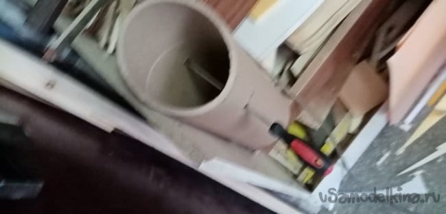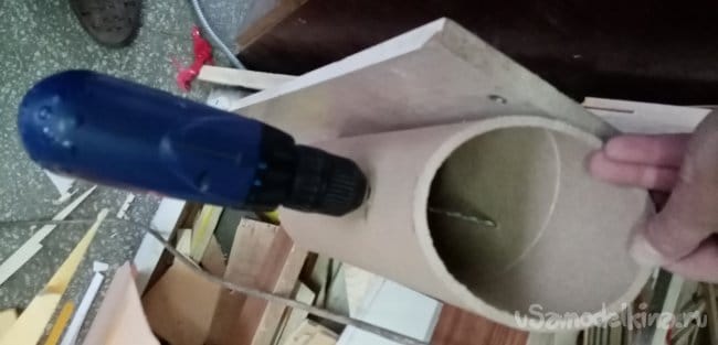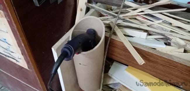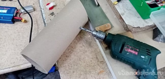 Устанавливаю картонную трубу в нужное место и еще более тонким, длинным сверлом делаю отверстие для вкручивания шурупа.