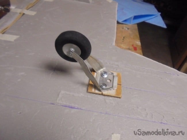 Из полоски алюминия, толщиной 2 мм и шириной 30 мм выпилил стойки шасси. Колёса установил, какие остались от старых авиамоделей.