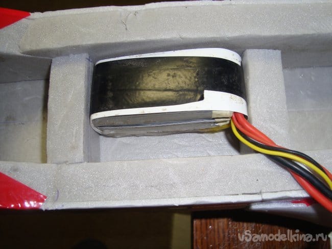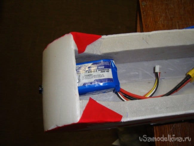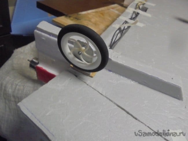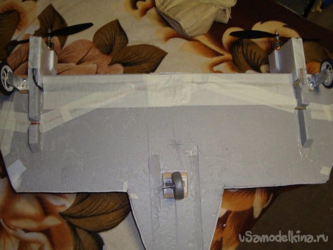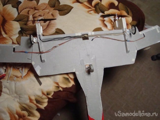 Сделал вырезы в нижней части модели, проложил провода от моторов, зафиксировал бумажным, малярным скотчем.