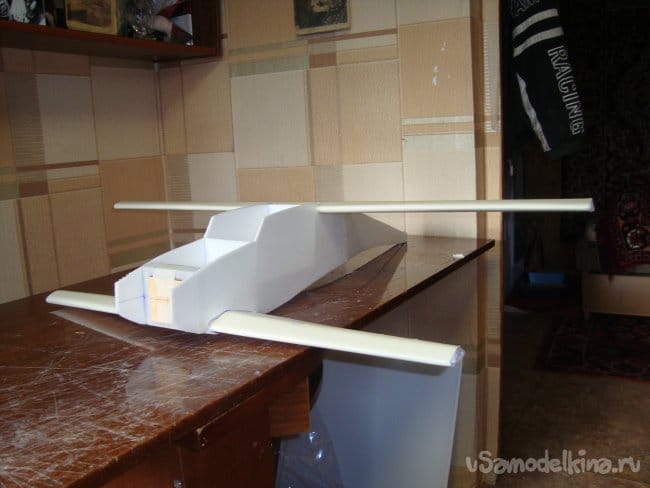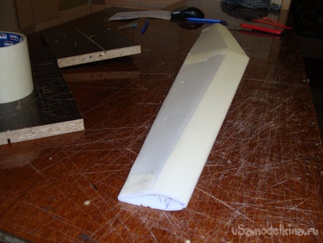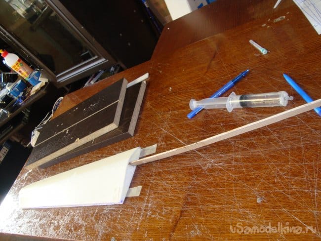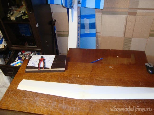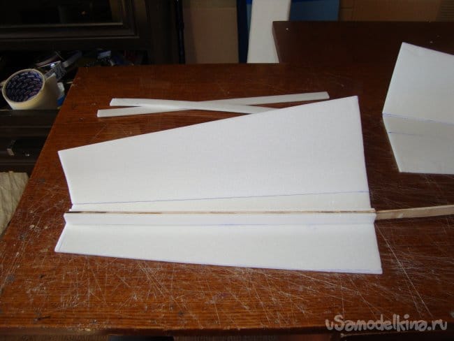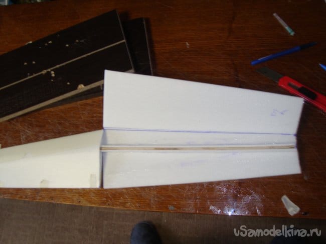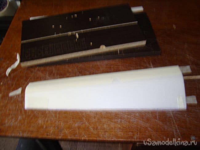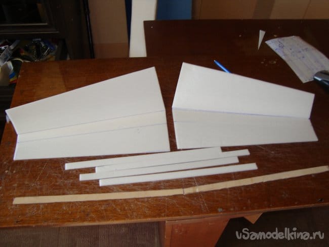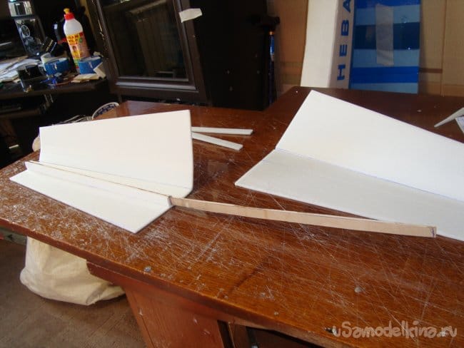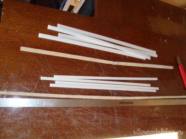 Прежде всего вырезал из фанеры, толщиной 3 мм. лонжероны, нарезал полосок из потолочной плитки для оклейки лонжерона с двух сторон.