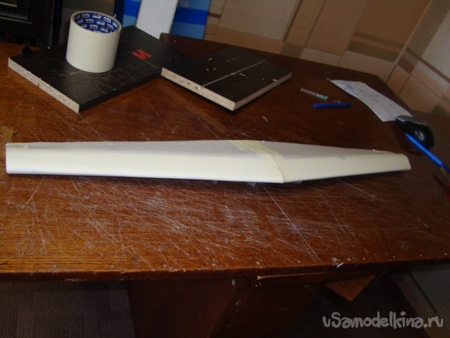 Начал с верхнего крыла. Вырезал заготовки, вклеил фанерный лонжерон и вклеил полоски из потолочки, сначала в левую консоль.