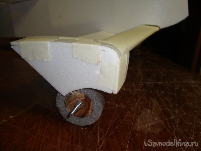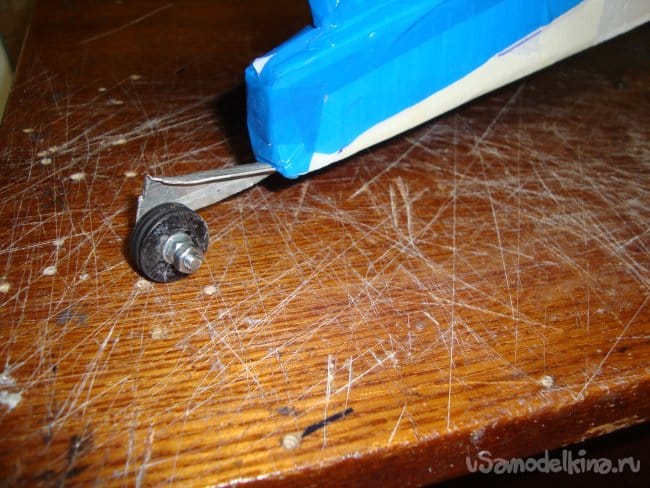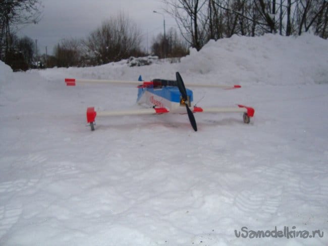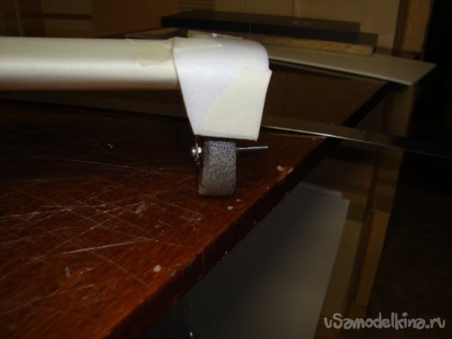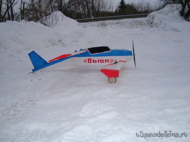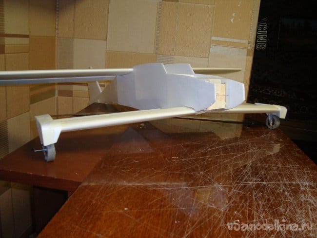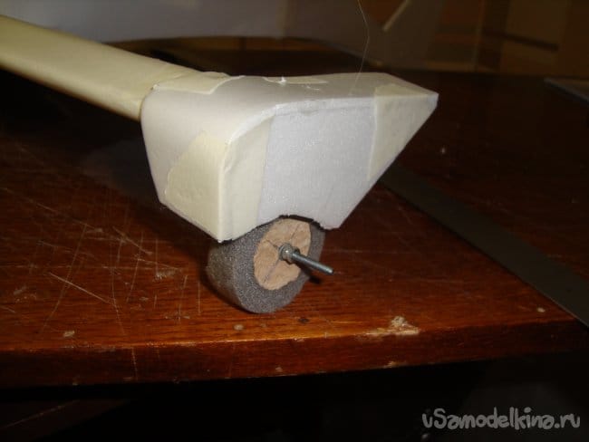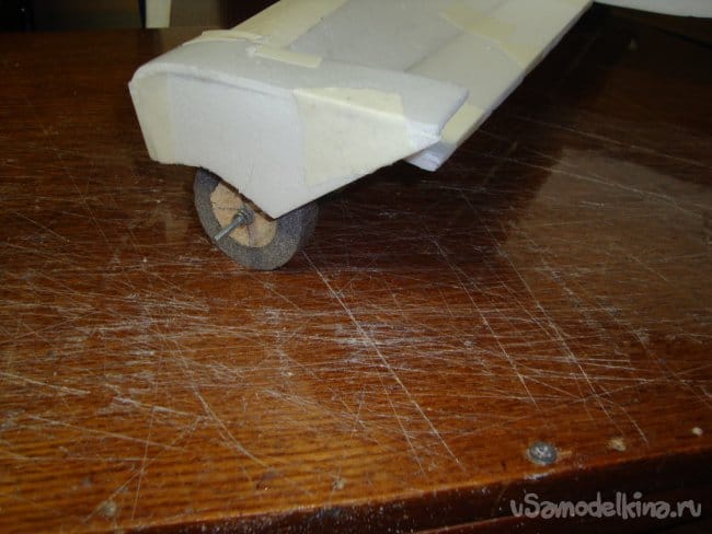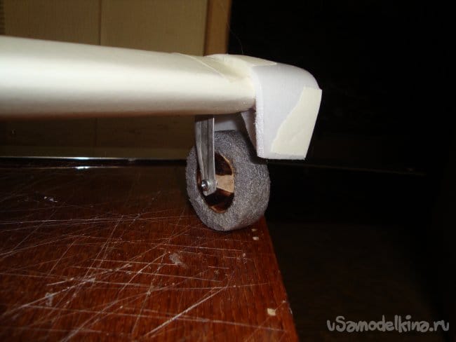 Из подручных материалов соорудил маленькое колёсико, сделал стойку из полосы 1,5 мм алюминия. Смонтировал на хвостовом конце фюзеляжа.