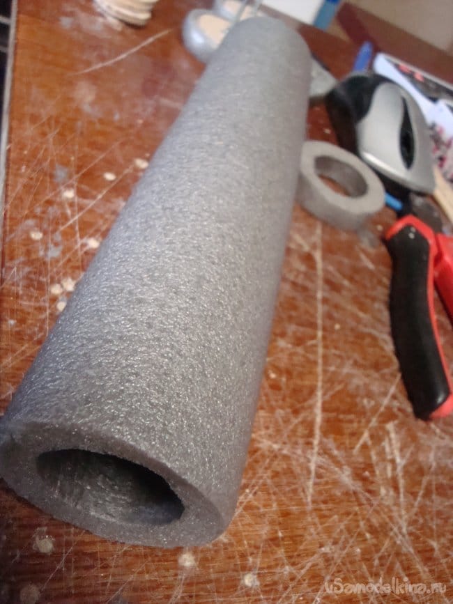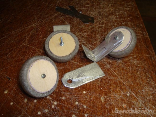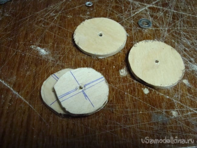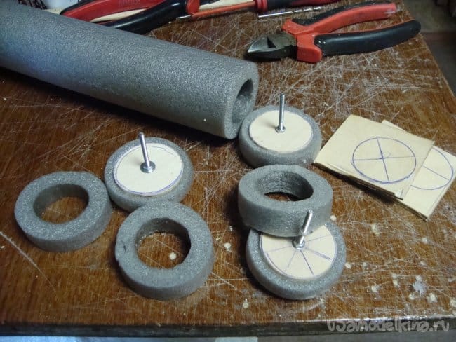 Колёса самодельные. Нарезал из фанеры , толщиной 3 мм кружочки разного диаметра. Размер подгонял под имеющийся у меня утеплитель для труб отопления.