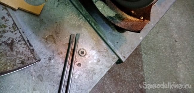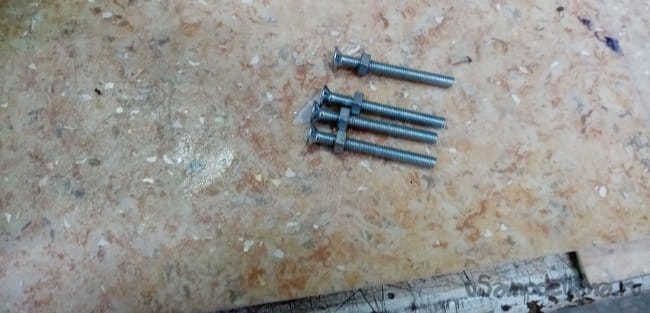 К столику рога будут крепиться болтиками подходящего диаметра. Подбираю размер из коробочки. Диаметр подошел. Они плотно вкручиваются в трубочки, даже резьбу нарезать не нужно. Но длина великовата. Накручиваю гайки и отпиливаю нужную длину пилой по металлу. Затем гайки скручиваю и замятая резьба, восстанавливается.