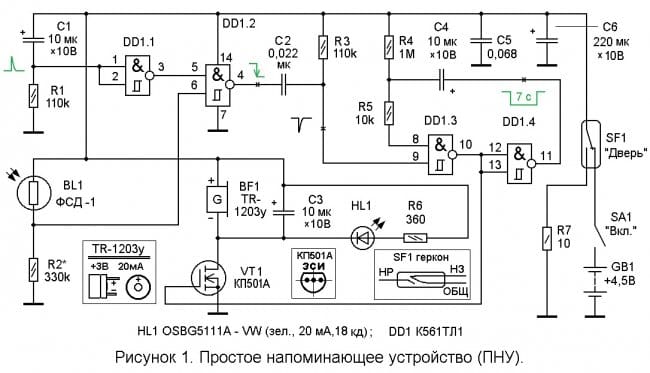 Питание ПНУ включается тумблером SA1. В исходном состоянии входная дверь закрыта и постоянный магнит, закреплённый на верхней (внутренней) части двери удерживает геркон SF1 в сработанном состоянии (левом по схеме - на рисунке 1 - положении). При открывании входной двери постоянный магнит удаляется от геркона и его контакты устанавливаются в правое (по схеме) положение, а напряжение GB1 поступает в схему ПНУ. Конденсатор C1 начинает заряжаться через резистор R1. В течение примерно 1 - 2 секунд на обкладке «минус» С1 присутствует плавно уменьшающееся напряжение, которое подаётся на входы (выводы 1 и 2) инвертора DD1.1. По окончании стартовой установки на выходе (выводе 3) DD1.1 устанавливается высокий логический уровень, разрешающий прохождение сигнала от точки соединения фоторезистора BL1 и резистора R2 [со входа (вывод 6) DD1.2] на выход (вывод 4) DD1.2. Причём, сигнал на этом элементе инвертируется.