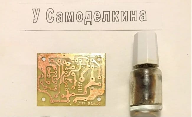 Полуготовая плата ПНУ слегка зачищается, обезжиривается и покрывается жидкой канифолью. Истолчённую в порошок канифоль можно разводить в спирте, муравьином спирте (ужасно пахнет, но зато не дорого продаётся в аптеках) и некоторых других спиртосодержащих жидкостях. Если раствор жидкой канифоли получился излишне жидким, то ПП таким раствором рекомендуется покрывать 3-5 раз. Быстро высушить плату можно, например, на работающей батарее центрального отопления.