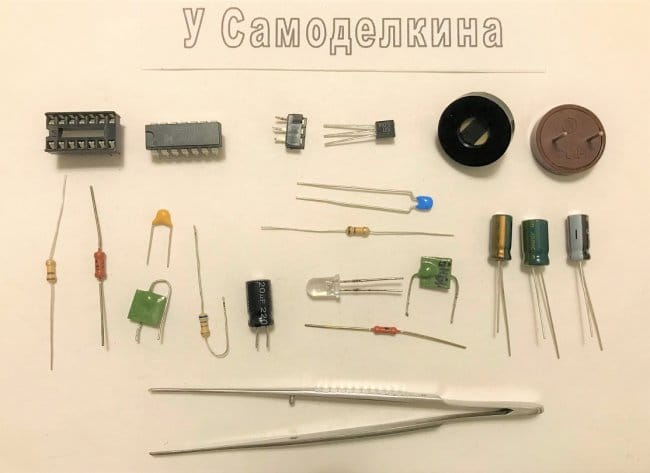 Радиоэлектронные компоненты, использованные при изготовлении ПНУ, изображены на рисунке 8. Детали DD1 и VT1 следует защитить от статического электричества. Для этого они устанавливаются в специальные розетки по окончании пайки остальных деталей.
