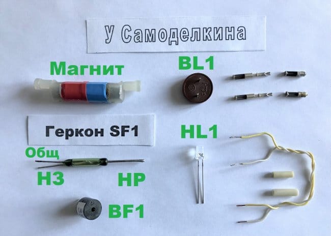 - тумблера SA1 «Вкл.», геркона SF1 «Дверь», батареи GB1 и низкоомного резистора R7, обеспечивающего (при необходимости) быстрое повторное включение ПНУ.