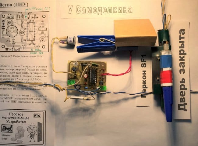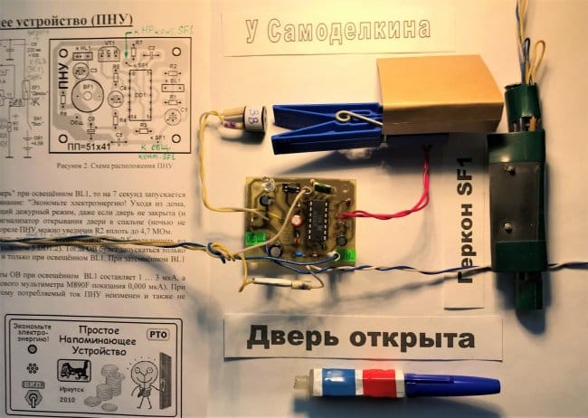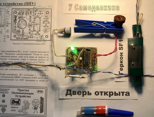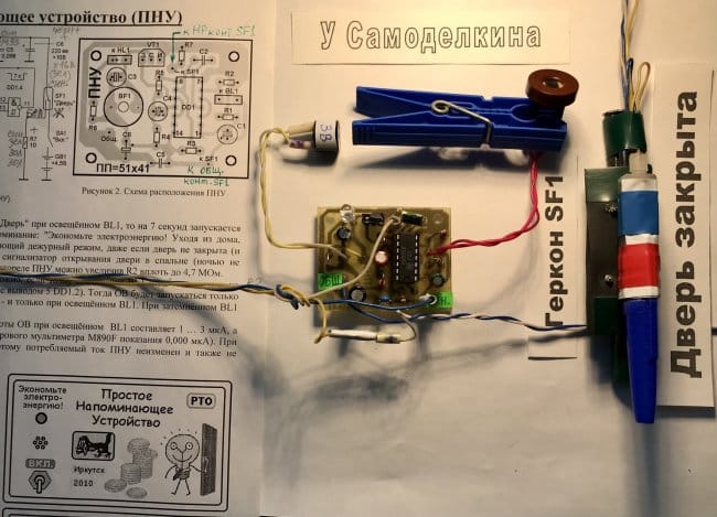 Простое напоминающее устройство (далее просто ПНУ) можно отнести к изделиям, помогающим экономить электроэнергию. ПНУ в момент открывания входной двери подсказывает уходящему из квартиры о необходимости (в целях экономии) выключить в прихожей освещение. В течение 7 секунд, включён комплексный (светозвуковой) сигнал: работает зуммер и подсвечивается табло - напоминание: «Экономьте электроэнергию! Уходя из дома, выключите свет в прихожей!». Затем ПНУ переходит в энергосберегающий дежурный режим, даже если дверь не закрыта (и питание ПНУ осталось включённым). Если входная дверь открывается в момент, когда светильник в прихожей уже выключен, то ПНУ никак себя не проявляет, оставаясь в высокоэкономичном дежурном режиме.
