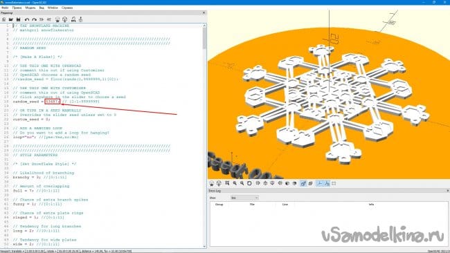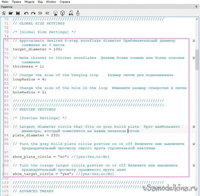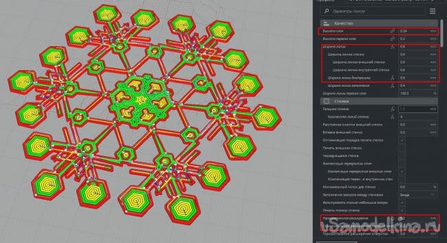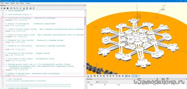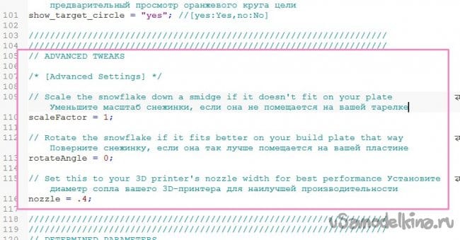 Далее можно задать целевой диаметр снежинки в мм, толщину, и пр. Также можно указать диаметр сопла, модель будет рассчитываться с его учетом.