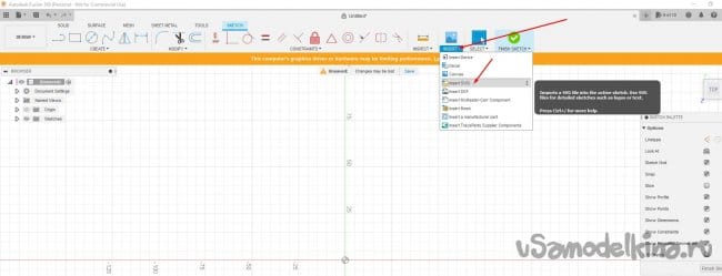 Далее нужно скормить программе нашу созданную векторную картинку. Под значком картинки нажимаем «Insert», и в раскрывшемся подменю выбираем «вставка SVG», и указываем путь к файлу.