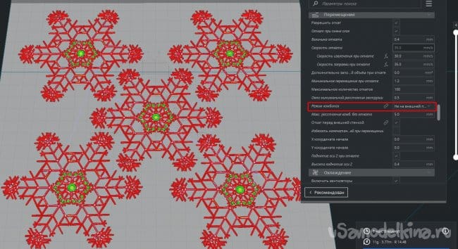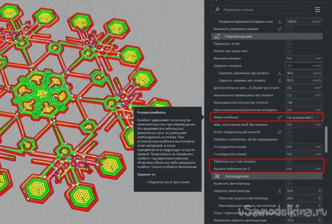 Чтобы все печаталось быстро, без «паутины» и соплей на внешних границах, включаем режим комбинга «не на внешней оболочке».