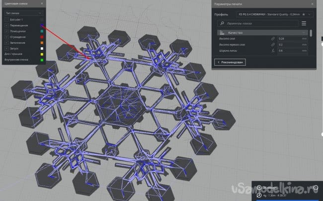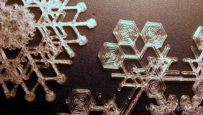 Первые снежинки я печатал соплом 0,4 и такой же шириной линии. Текстура получалась довольно размытой и нечеткой. Я же хотел добиться схожести с природной структурой кристаллов снежинок.