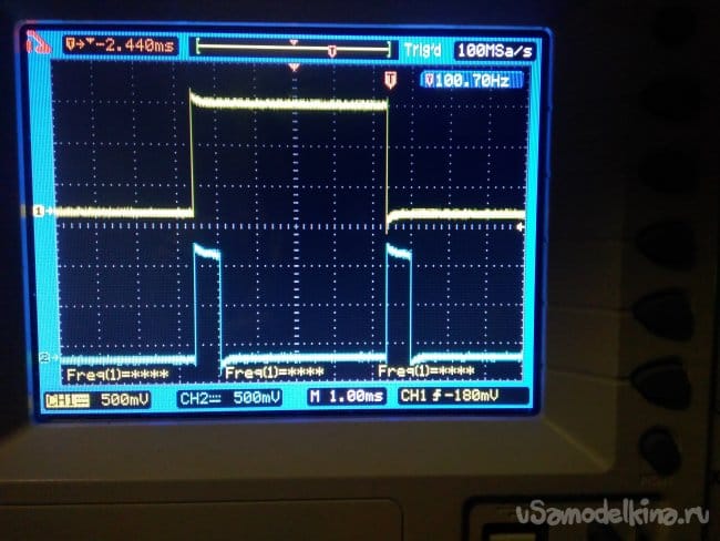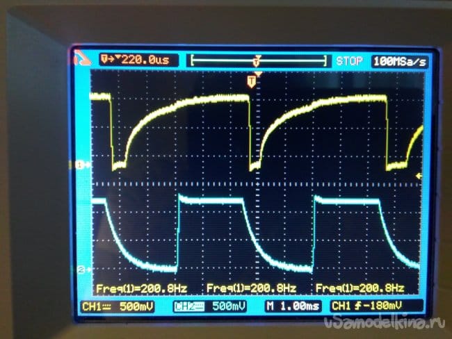 Релаксатор собран на элементах DD1C, DD1D, осциллограммы входные вверху, выходные внизу.