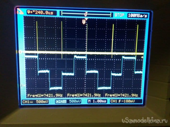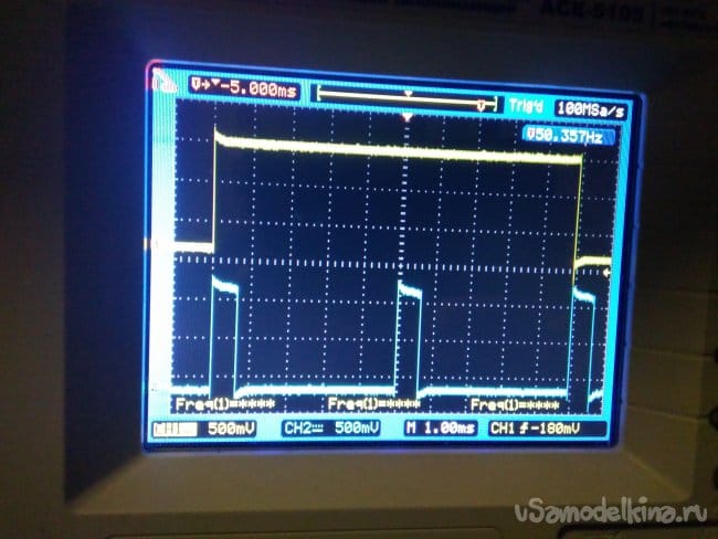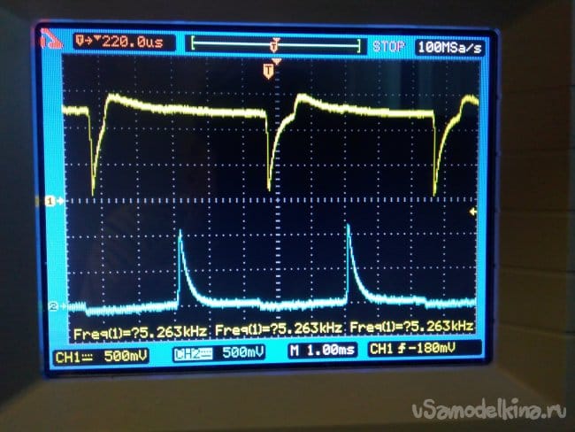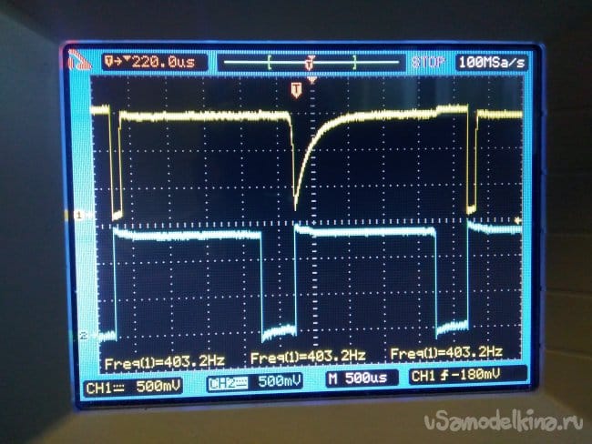 При кратковременном прикосновении к сенсору пальцем руки, транзистор VT3 открывается и микросхема К145АП2, начинает работать. На коллекторе транзистора VT4, появляются импульсы (нижняя осциллограмма)