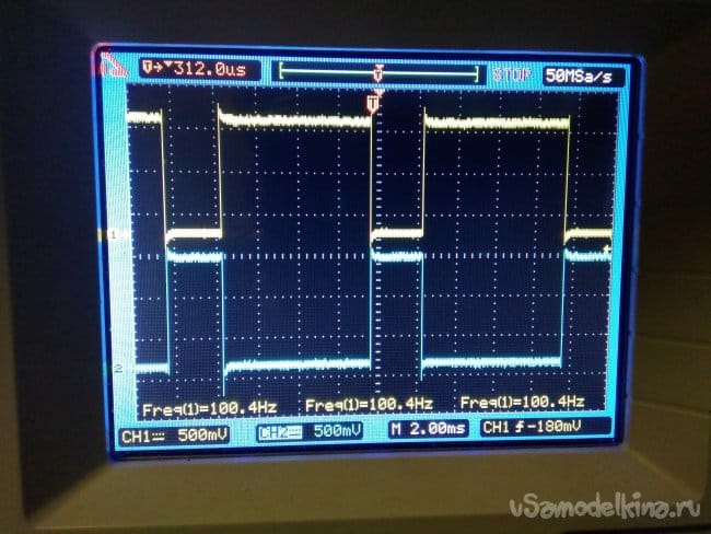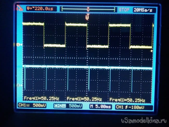 Работу релаксатора я описывал ранее и тут ничего мудрёного нет. Подробное описание в публикации - Диммеры ОСС. Чтобы использовать алгоритм работы микросхемы К145АП2, с применяемой частотой осветительной линии 200 Гц, необходимо подать на вход синхронизации, этой микросхемы, импульсы с частотой 50 Гц. Для получения этой частоты, я сформировал специальный сигнал 200 Гц. Он получился с применением элемента DD1В, путём интегрирования сигнала с выхода DD1A, ножка 3 и задающими время длительности импульса, элементами С7,R10,VD5. С выхода DD1B, ножка 4, специальный сигнал, поступает на счётный вход микросхемы DD2A и обеспечивает надёжную (без срыва счёта) работу микросхемы. DD2A и DD2B, элементы делителя частоты. Вот такая осциллограмма их работы.