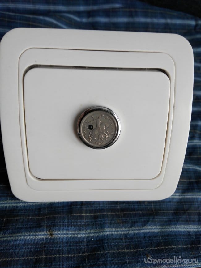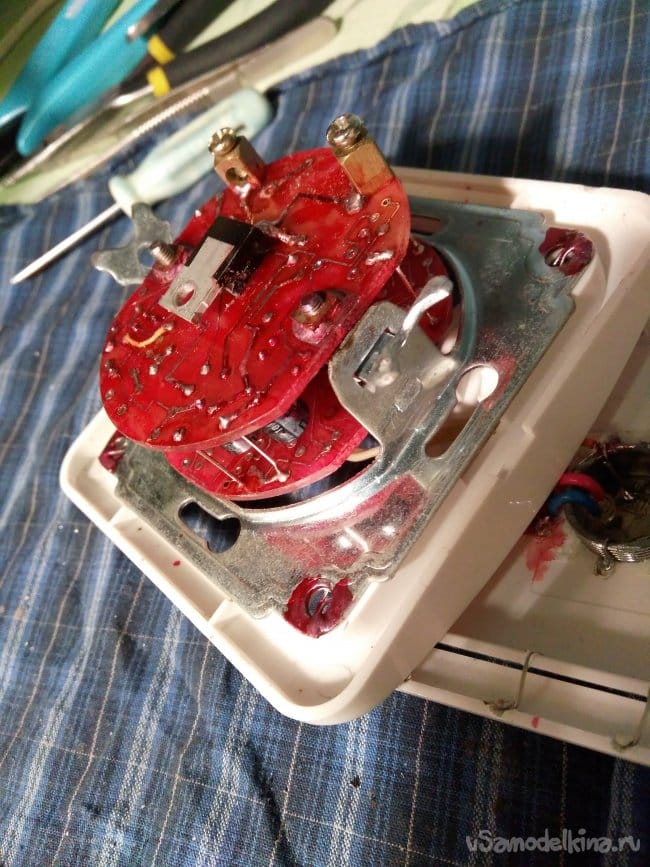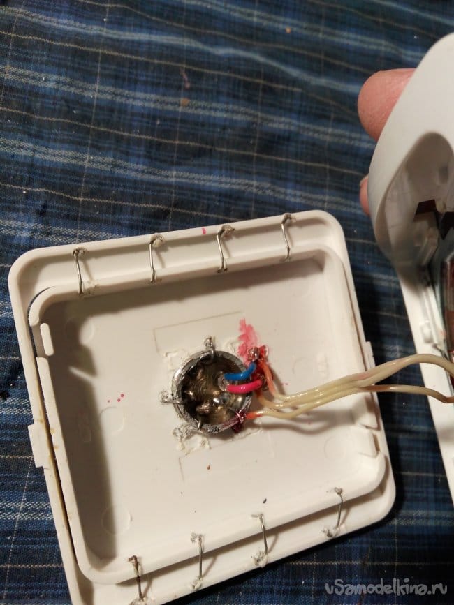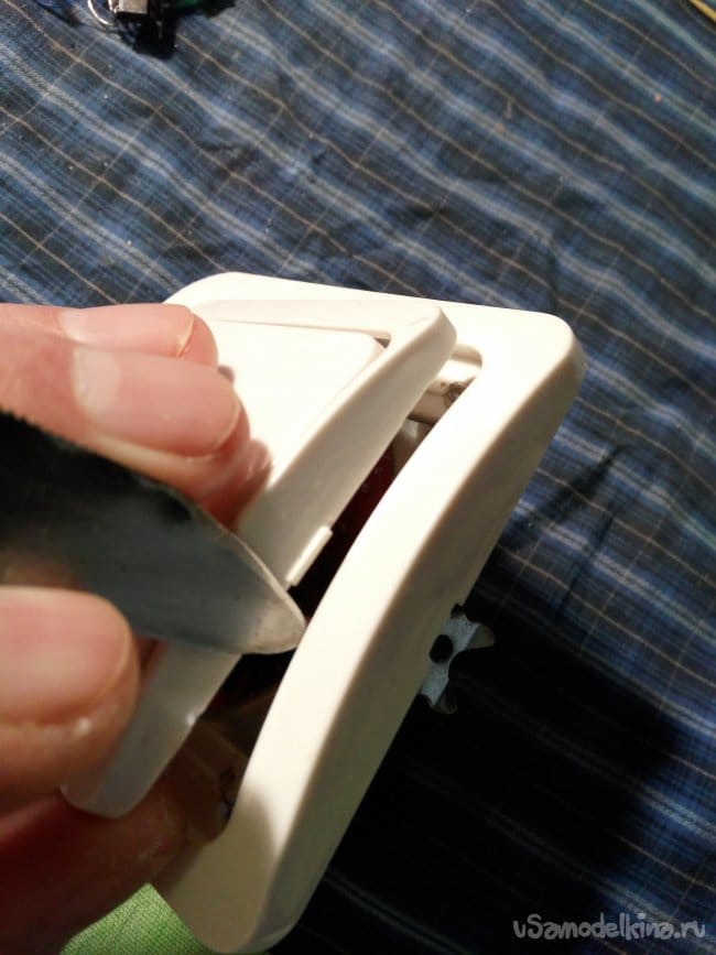 Из обычного выключателя, тоже выбрасываю всё "лишнее". Остаётся только металлическое основание, рамка и лицевая панелька. Съём лицевой панельки осуществляю тонким ножиком, вывожу из фиксации защёлки.