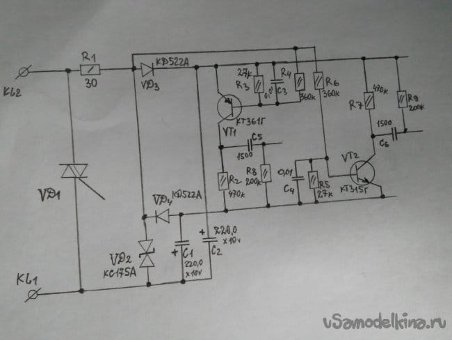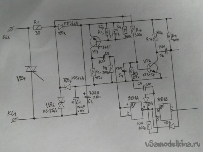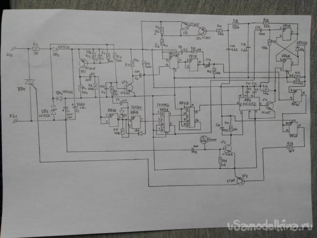 Транзистор открывается на время длительности импульса. И отрицательный потенциал с коллектора VT7 поступает на управляющий электрод симистора. Вот как-то так, в общих чертах, работает вся принципиальная схема. Чтобы убедиться в безупречности функционирования схемы, я собирал её "скелетным"