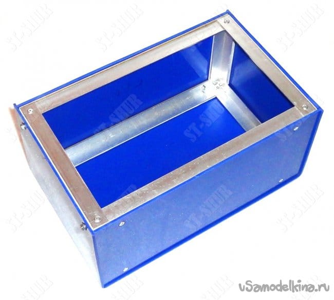 Передняя и задняя панели были вырезаны из такого же пластика, что и крышка. Крышка крепится к каркасу с помощью винтов от компьютерных корпусов, диаметром 3мм, в местах наложения профилей друг на друга (что увеличивает глубину нарезки резьбы в каркасе до 3мм).