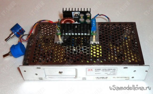 В качестве основы электронной начинки был использован довольно качественный импульсный, стабилизированный источник питания «HAITAIK» HTS-150-24 (CV 24V 6,5A). Данный блок имеет встроенную защиту от перегрузки и КЗ, а так же сетевой фильтр. Выходное напряжение 24V данного блока довольно удобно т.к. позволило подключить вентилятор и цифровой AV-метр без использования дополнительных стабилизаторов. Так же этот блок имеет приличную мощность.