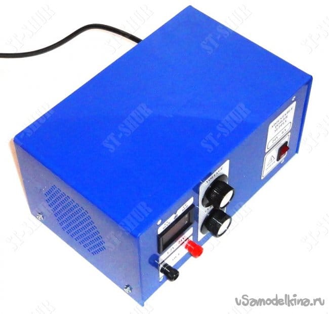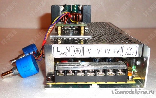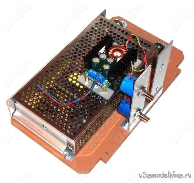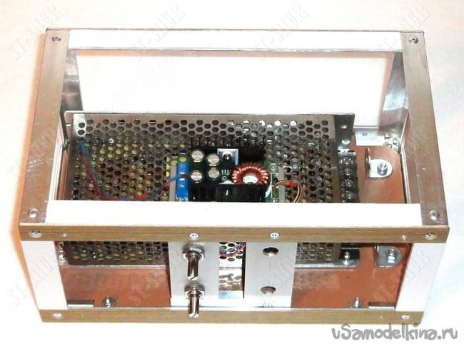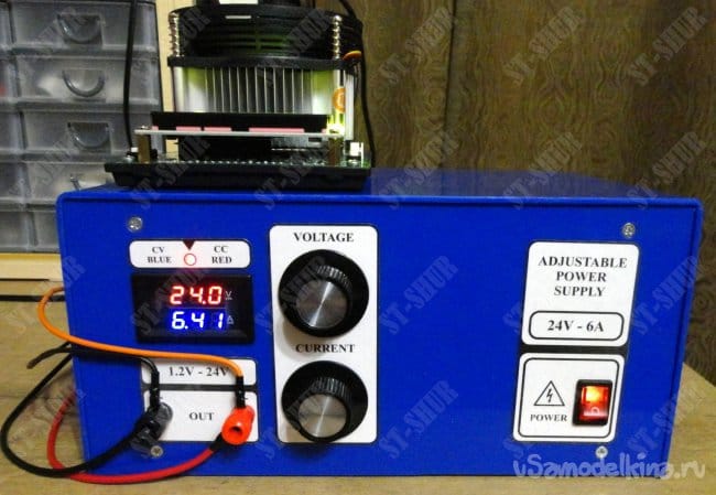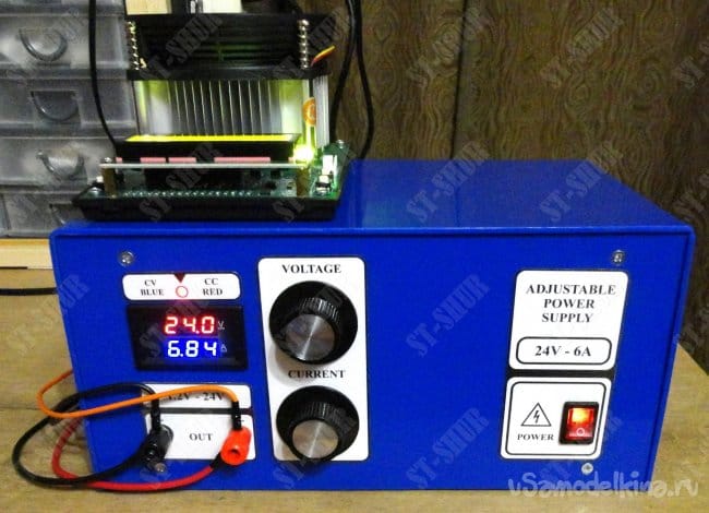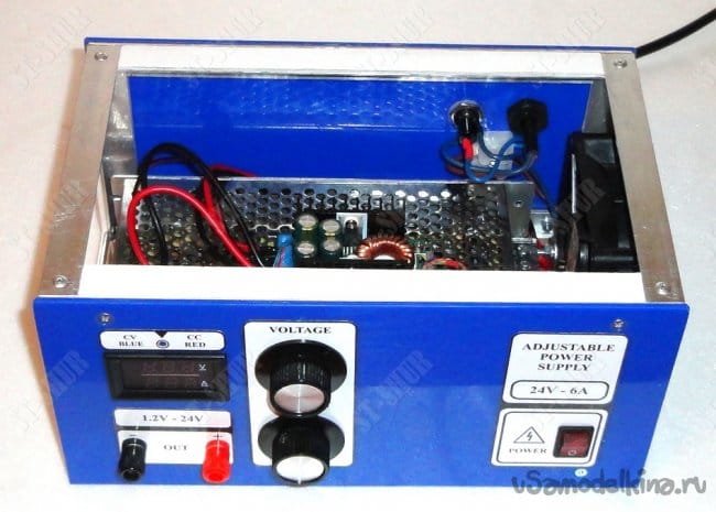 - Для начала собрать в корпусе импульсный блок питания с регулировкой напряжения и тока, используя имеющийся импульсный источник питания (или ИБП) и готовые китайские модули. Для работы со светодиодными изделиями, аккумуляторами, нагревательными элементами и пр. устройствами не особо чувствительными к шумам.