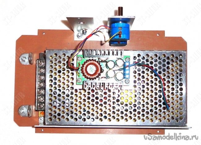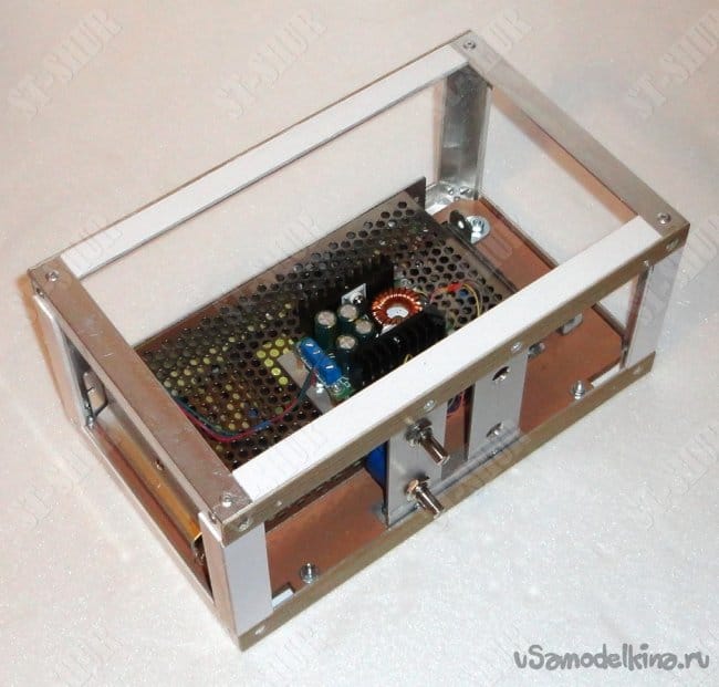 Далее источник питания, крепежные планки потенциометров и металлические уголки (размерами 20х20х16х1,5мм) для крепления вентилятора, с помощью винтов были закреплены на днище.