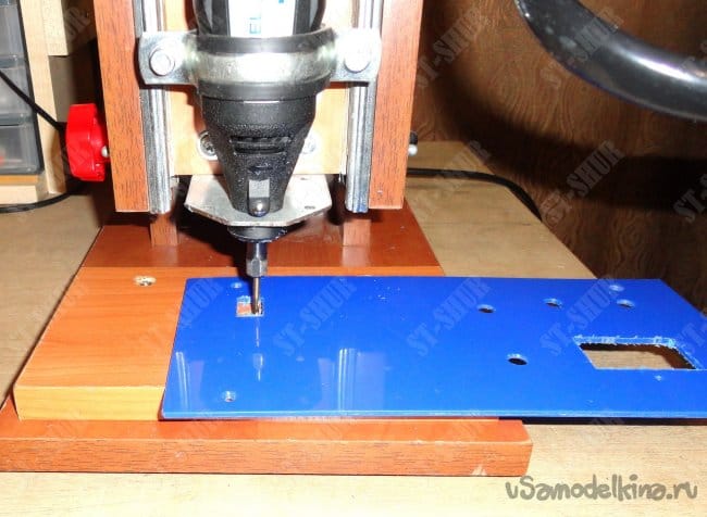 Отверстия в передней и задней панелях были сделаны с помощью МФИ «Dremel» на стойке, с использованием прямой фрезы по дереву.