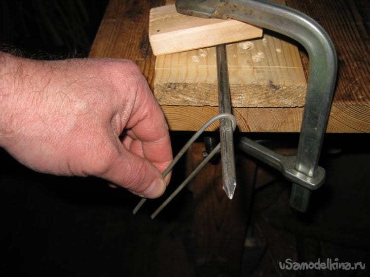 Шаг 2. Для удобства формирования крючков, я буду использовать большой гвоздь диаметром 6 мм, в качестве оправки. Для большего удобства закрепим этот гвоздь на верстаке при помощи струбцины.