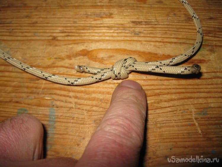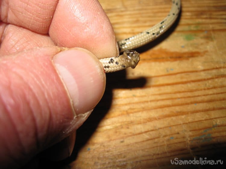 Поскольку шнур синтетический, оплавляем его кончики при помощи спички или зажигалки.