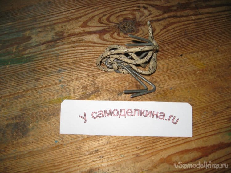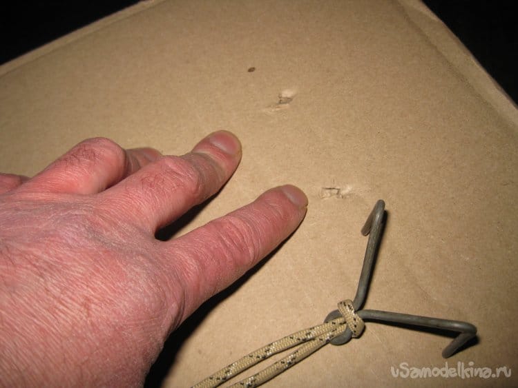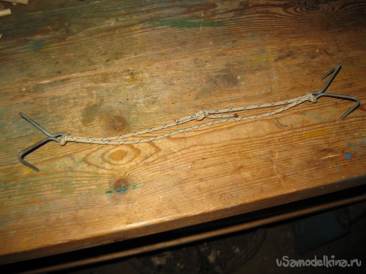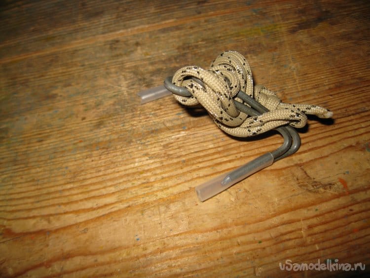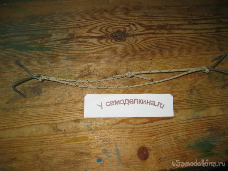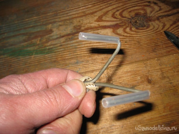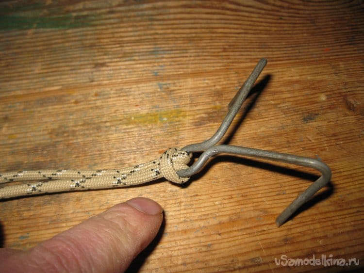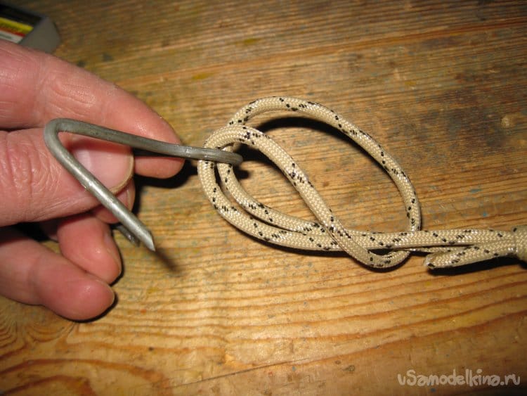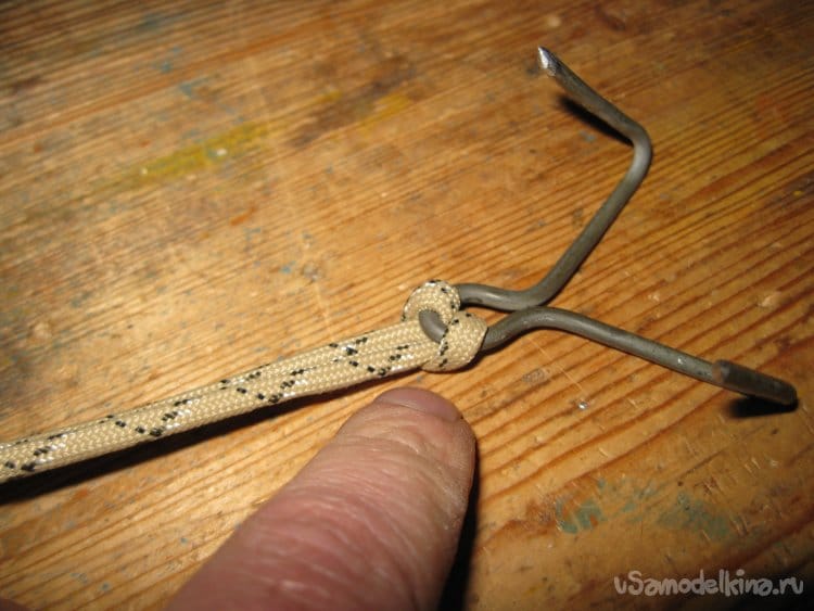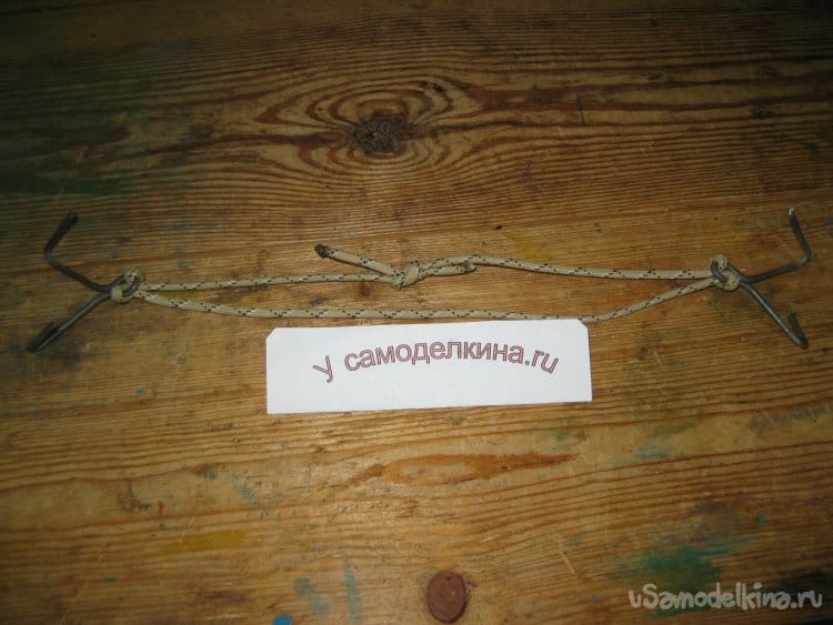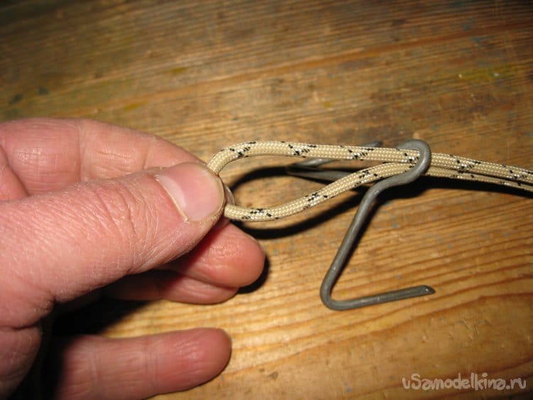Шаг 2. Привязываем шнур к одному из крючков, делая глухую петлю.
