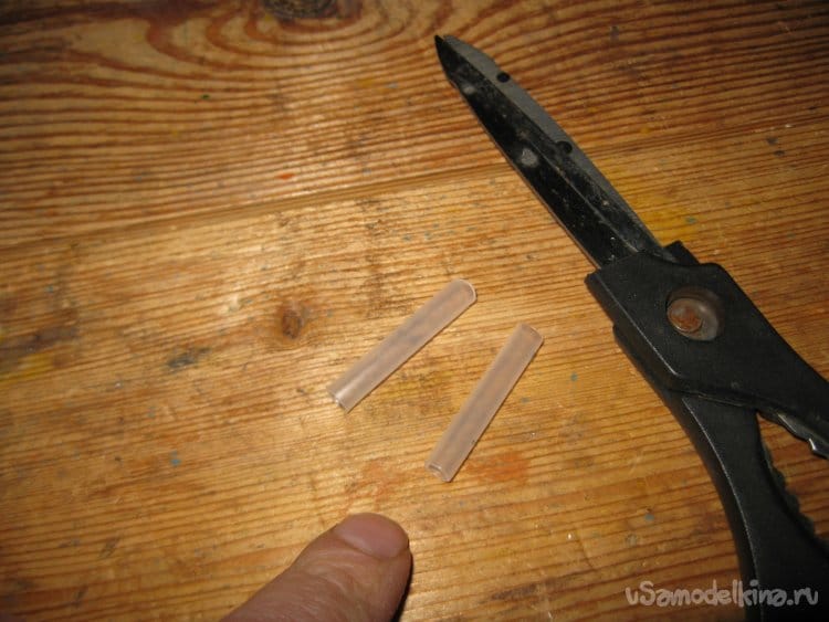 Шаг 3. Отрезаем ножницами, два небольших кусочка от пластиковой трубочки, взятой из дозатора жидкого мыла.