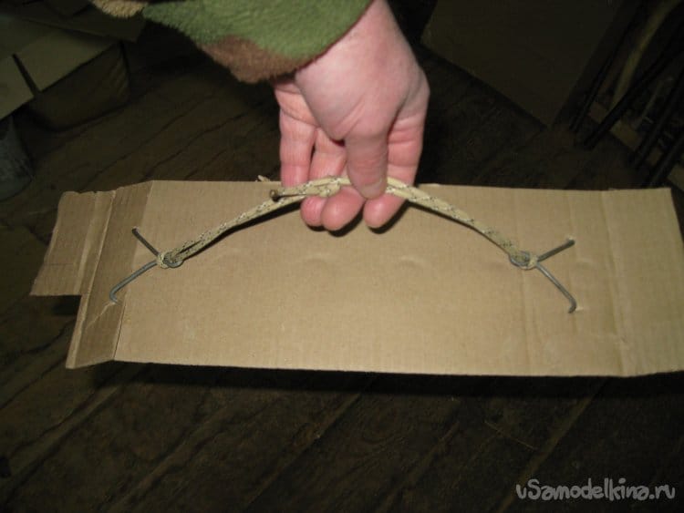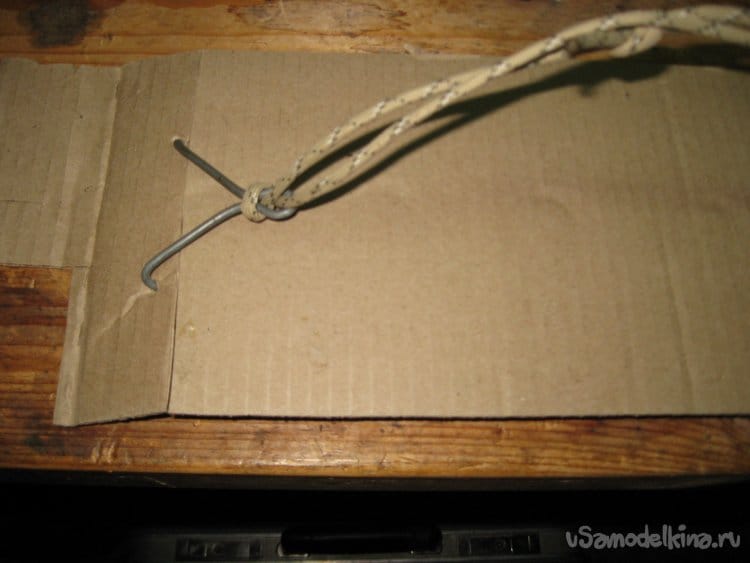 Надо сказать, что сама идея данной ручки довольно проста. Эта ручка будет состоять из двух двойных проволочных крючков, связанных прочным шнуром. Для переноски коробки, крючки нужно будет воткнуть в одну из сторон коробки и таким образом, коробку можно будет переносить, держа ее за шнур.