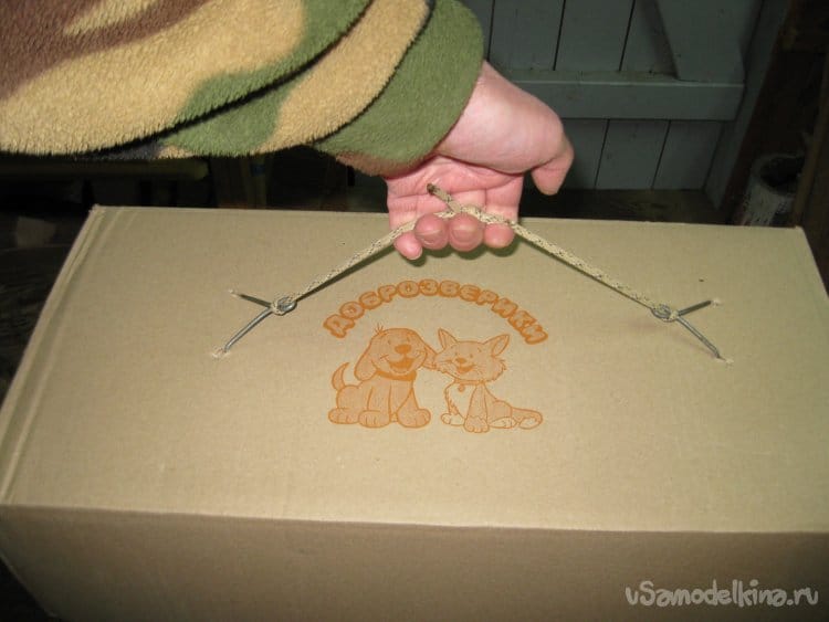 Итак, при необходимости переноса большой коробки, мы ставим ее узкой стороной вверх и, примерив, втыкаем в нее сначала один крючок нашей ручки.