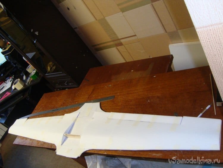 После склеивания, навешиваю элероны на малярный, бумажный скотч.