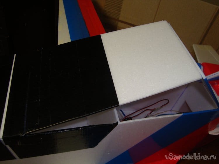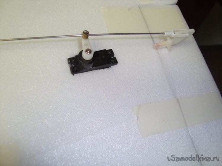 Смонтировал сервомашинки, вклеил кабанчики и подсоединил тяги на элероны.