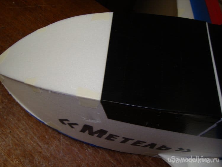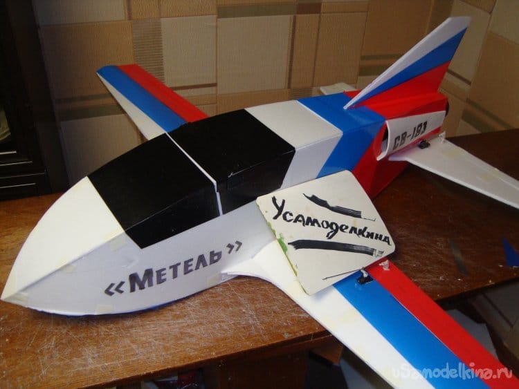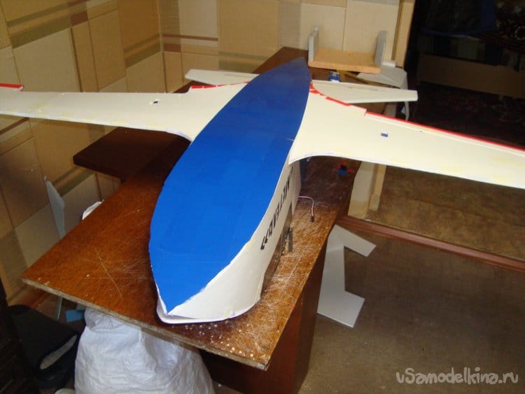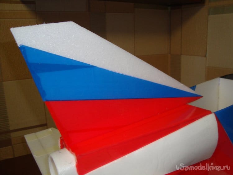 Закончил обтяжку модели цветным скотчем, смонтировал киль нанёс надписи.